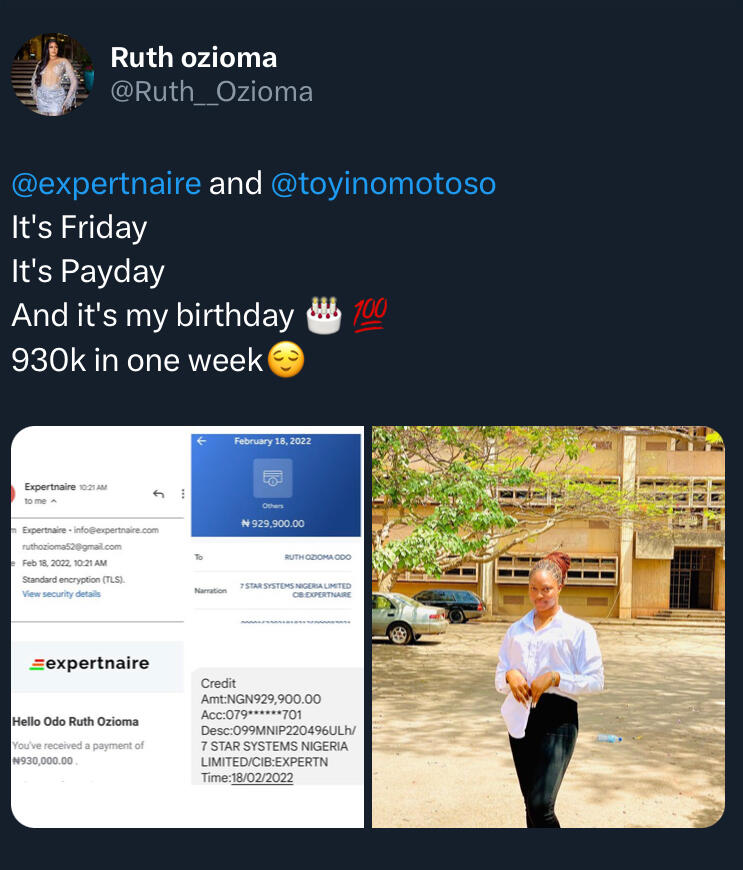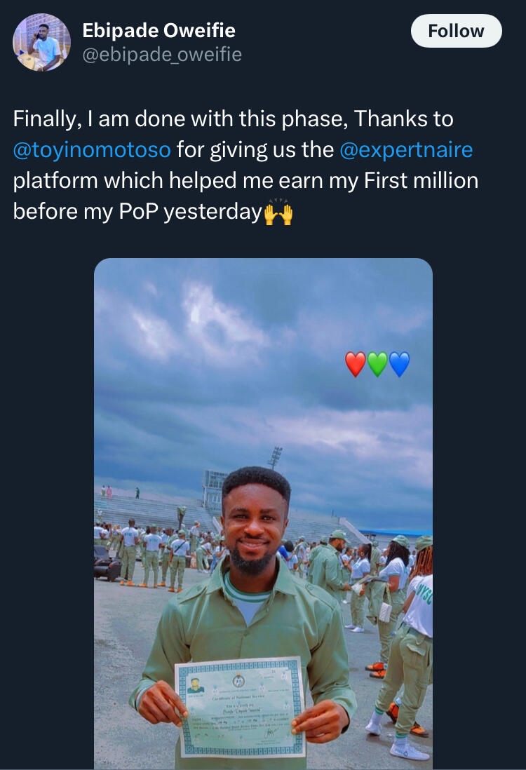 We also have Ebipade Oweifie who made his first million Naira with Expertnaire as a serving youth corper.