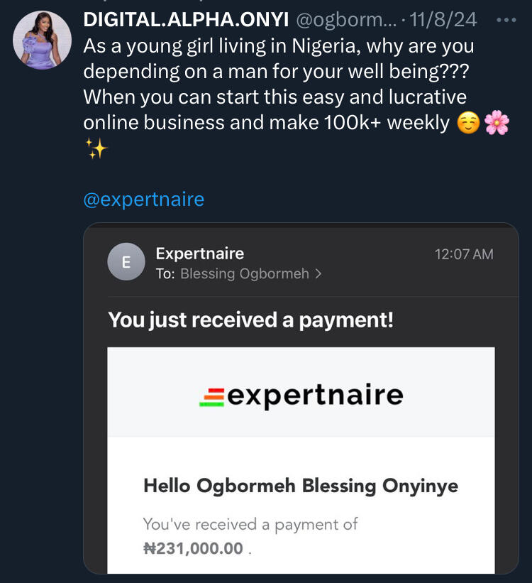 We also have Ogbormeh Blessing Onyinye , who made over ₦231,000 in 1 week On Expertnaire.
