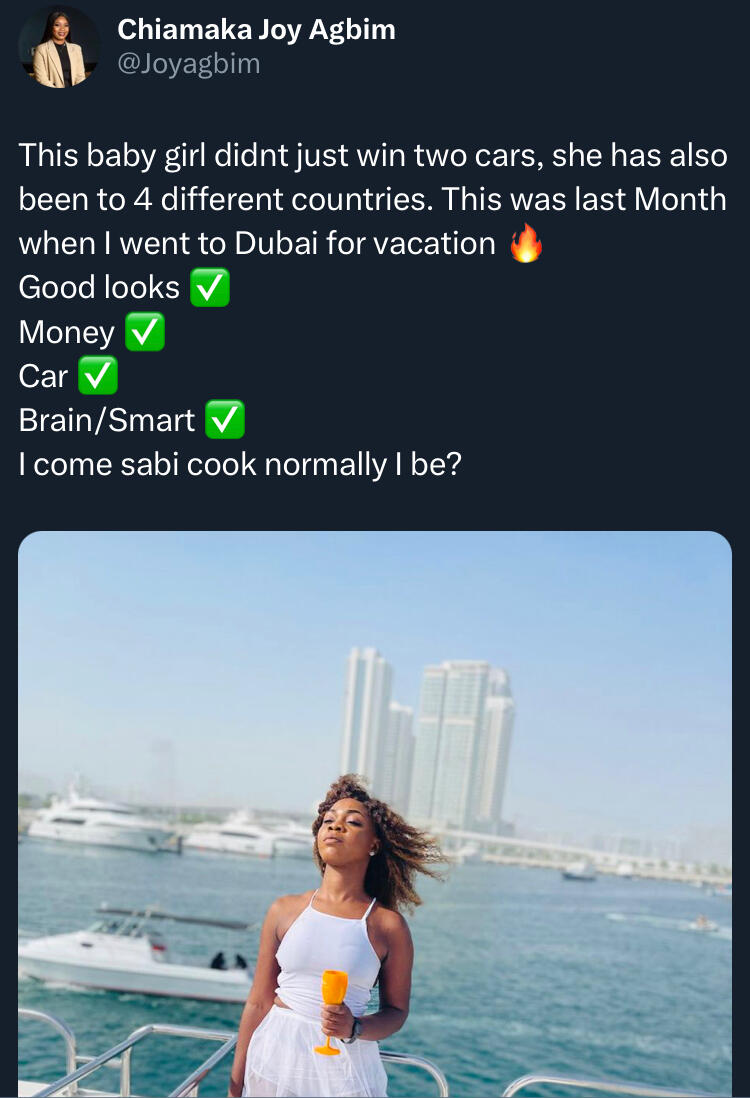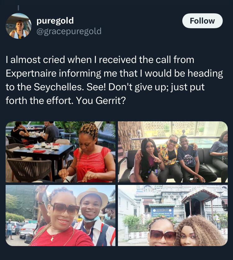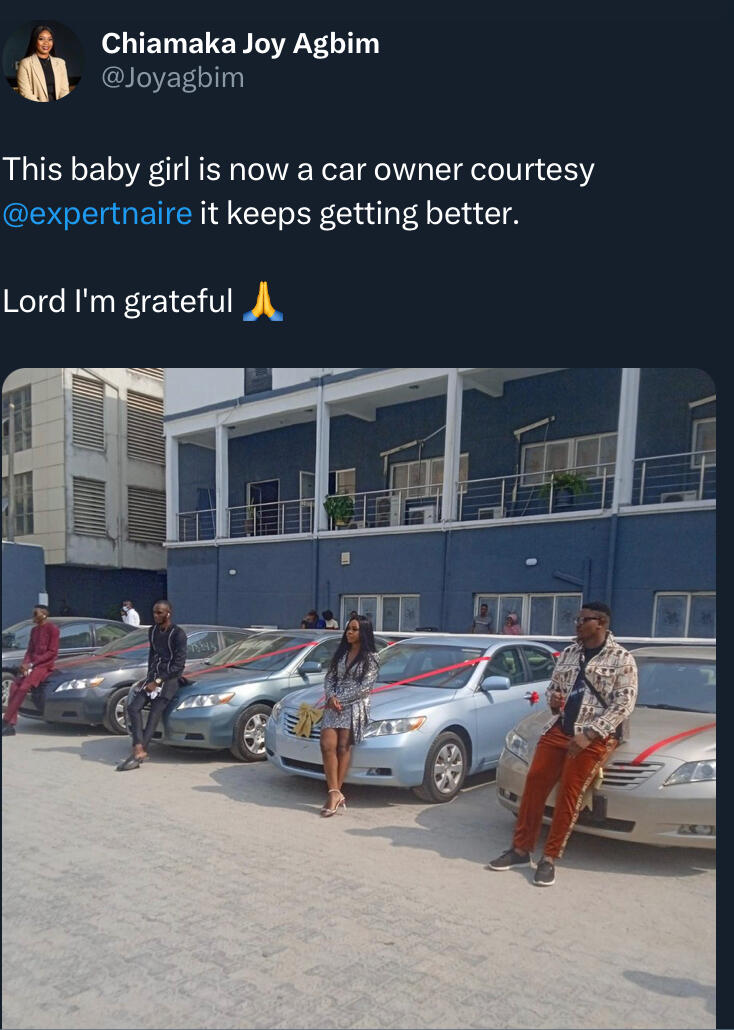 Then she went on to win two cars, travel to Egypt, Seychelles, Dubai and Qatar courtesy of Expertnaire and make as much as three million Naira per week.