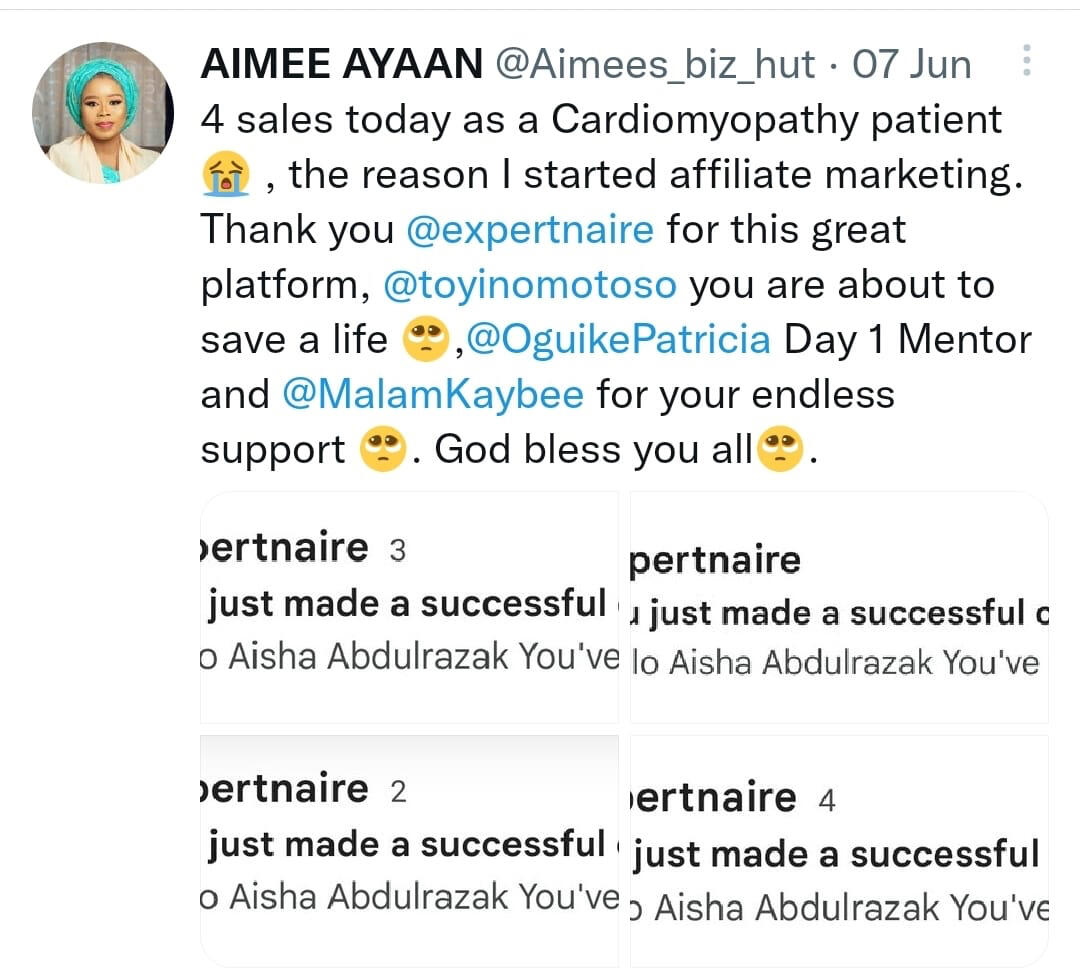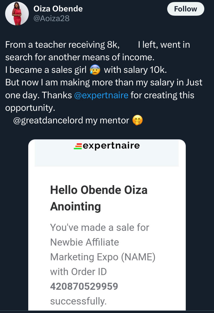 You can decide to be like Obende Oiza who was earning 8k / 10k monthly at her job, but within her first 4 months as an affiliate on Expertnaire she made ₦357,000