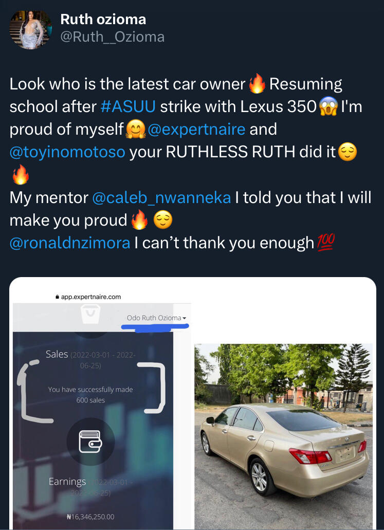 Ruth Ozioma has made over 10 Million Naira in sales as at the time of writing this, won a Lexus es350 with us and has also won vacations to four countries: Seychelles, Dubai, Qatar for the World Cup in 2022 and Rwanda, courtesy of Expertnaire.