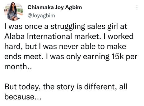 Someone like Joy Agbim who according to her was a struggling sales girl at Alaba International Market earning only N15k per month and even struggling to buy something as common as sanitary pad.